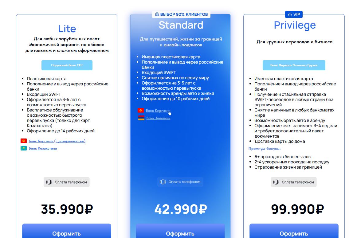 На сайте Cards Sky com есть блок с тремя тарифами по выпуску именной пластиковой карты: