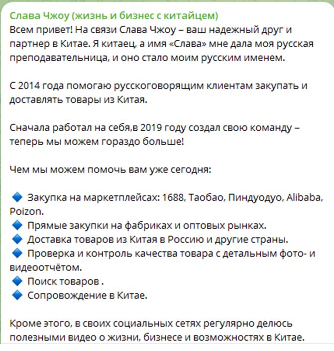 Слава Чжоу – китайский бизнесмен, который некоторое время жил в России, поэтому знает язык и ориентирован исключительно на российских инвесторов и владельцев бизнеса. О себе мужчина рассказывает очень мало – упоминает, что помогает делать закупки в Китае с 2014 года.