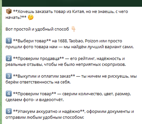 Товары из Китая! Я вот хотел заказать партию на 50000 рублей! Он типа обещает услуги по закупкам и доставке! А где инфа про стоимость услуг? Нет ее! Где юридические гарантии? Хзч! Я не буду доверять свои 50000 челу без документальных гарантий! Он просто поет сладко про Китай, а сам ничего не дает! Я лучше сам найду проверенного посредника!