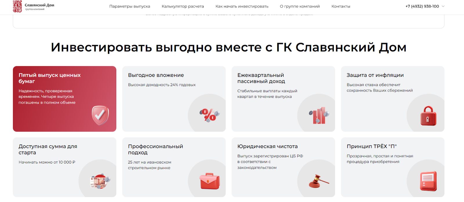 ГК «Славянский Дом» 26+ лет занимается строительством жилых и нежилых зданий в Иваново. Частью данной организации является эмитент ООО «СлавПроект». Он предлагает целевой аудитории вкладывать деньги в ценные бумаги ГК и получать ежеквартальный пассивный доход. Компания обещает будущим клиентам: