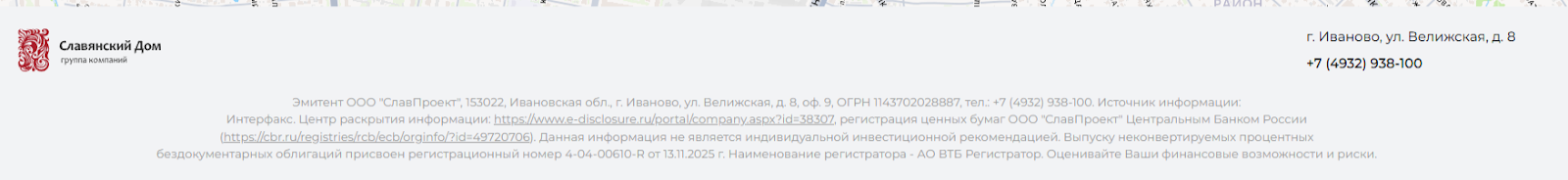 Портал ГК «Славянский Дом» выполнен в корпоративном стиле с ориентацией на инвестиционную тематику. Читаемые шрифты, строгий стиль, скромное число абзацев с текстом. В футере веб-сайта посетители обнаружат данные об эмитенте ООО «СлавПроект» (ОГРН 1143702028887) и регистрации ценных бумаг ЦБ РФ. Здесь же размещен адрес организации: 153022, Ивановская обл., г. Иваново, ул. Велижская, д. 8, оф. 9.