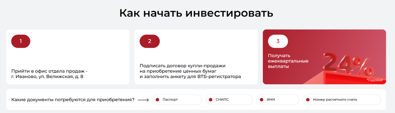 Стать инвестором ГК «Славянский Дом» не совсем просто. Для этого следует лично посетить офис организации по адресу: г. Иваново, ул. Велижская, д. 8. Облигации компании нельзя купить в режиме онлайн. Для приобретения ценных бумаг следует подписать договор купли-продажи и заполнить анкету для ВТБ-регистратора. Узнать подробности сотрудничества можно по номеру телефона +7 (4932) 938-100, в Телеграме и Вайбере +7 (930) 365-20-85.