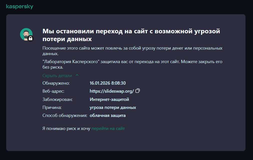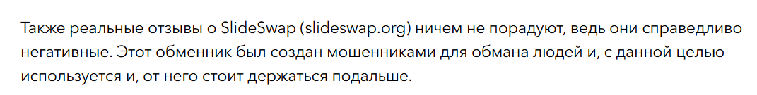 У проекта слишком много красных флагов, которые позволяют сделать вывод о низком уровне надежности, причем даже при входе на сайт появляется предупреждение антивируса, хотя по всем признакам сервис SlideSwap org на момент проверки проработал менее двух недель, а если сюда добавить остальные факты, вызывающие сомнение, возникает уверенность, что сайтом пользоваться не стоит.