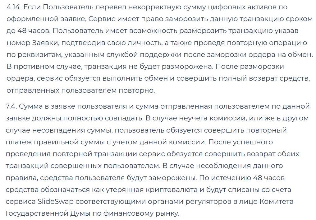 Курс в обменнике практически не отличается от других подобных сервисов, но сомнения вызывают подозрительные пункты в правилах, например, при одних и тех же условиях владельцы замораживают или возвращают платеж при ошибке в сумме.