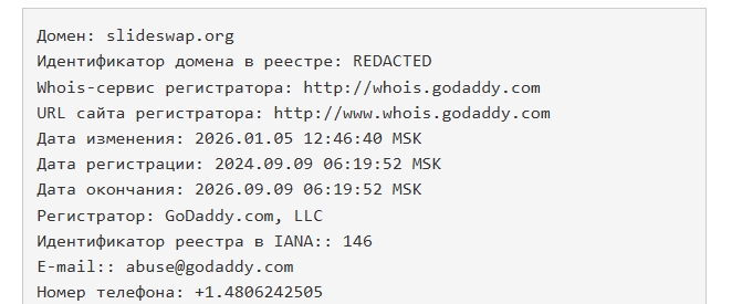 На сайте обменника SlideSwap org написано про начало работы в 2018 году, хотя данные с Whois ru показывают дату регистрации 09.09.2024, причем в одной из строк указаны изменения, которые произошли 05.01.2026.