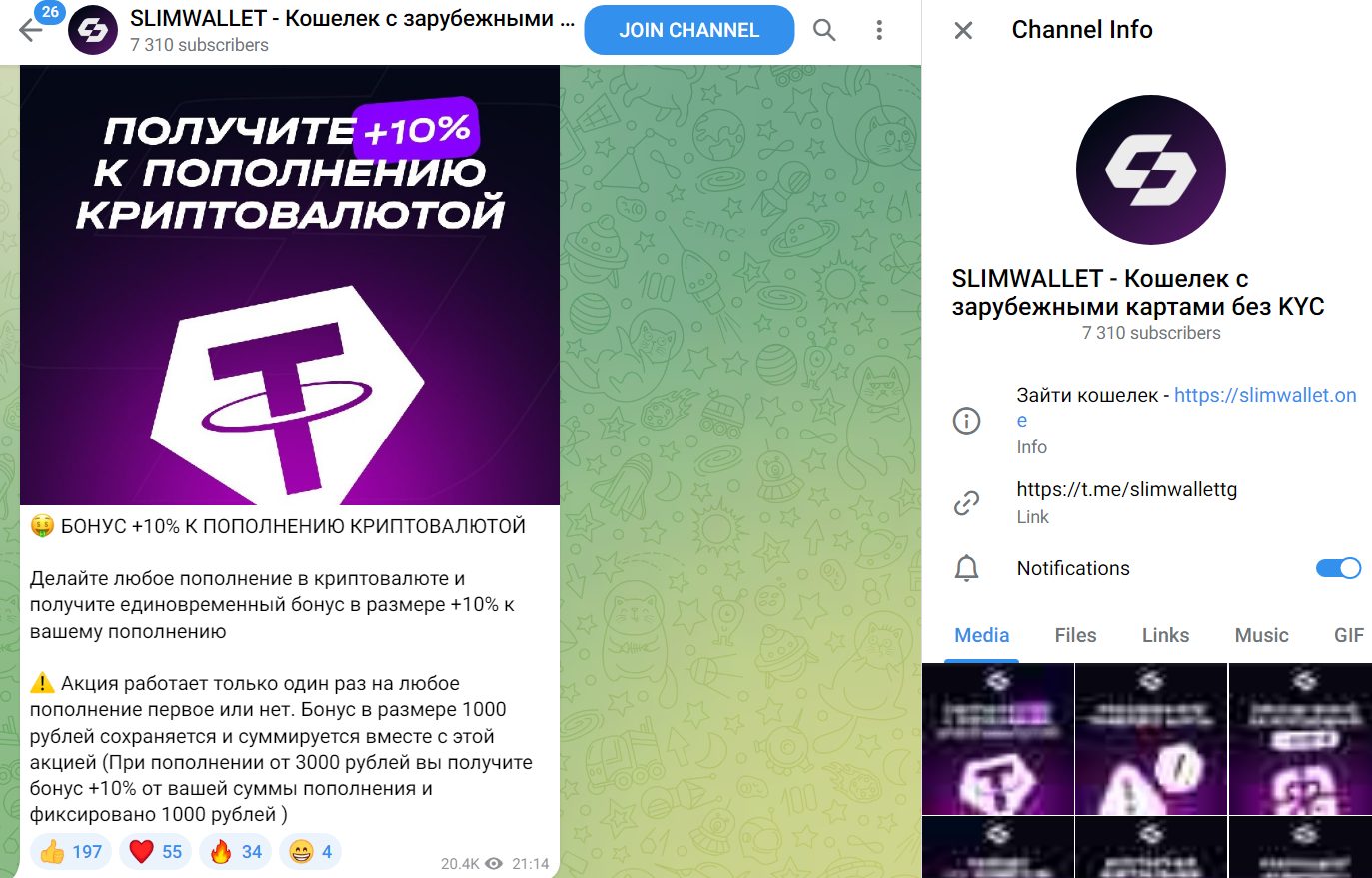 Tg-паблик SLIMWALLET Кошелек с зарубежными картами без KYC функционирует с 2025 года, и на него подписалось 7k человек.
