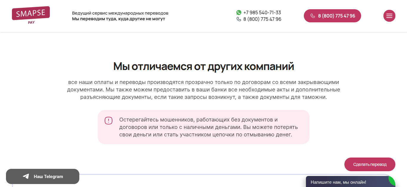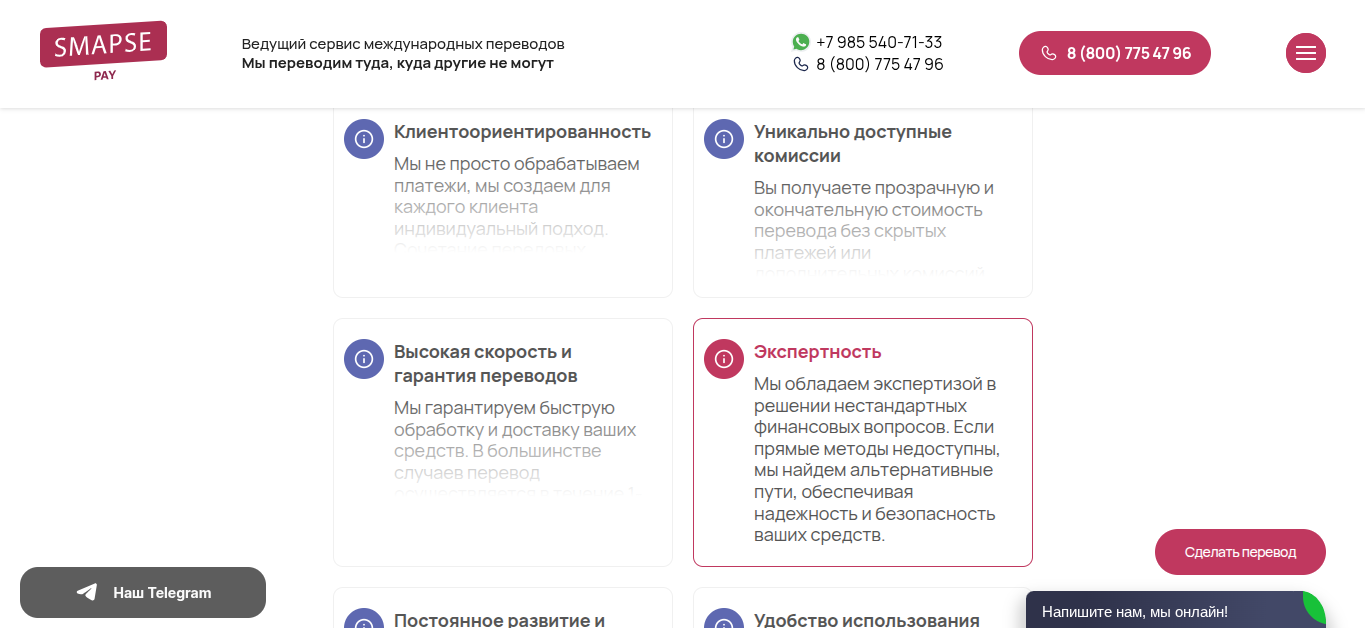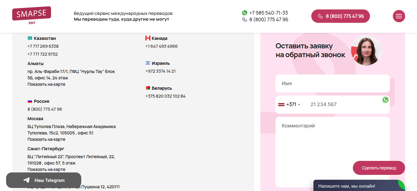 Консультацию от менеджеров Smapse Pay ru еще можно получить через онлайн-чат. Доступ WhatsApp — +7 (985) 540-71-33.