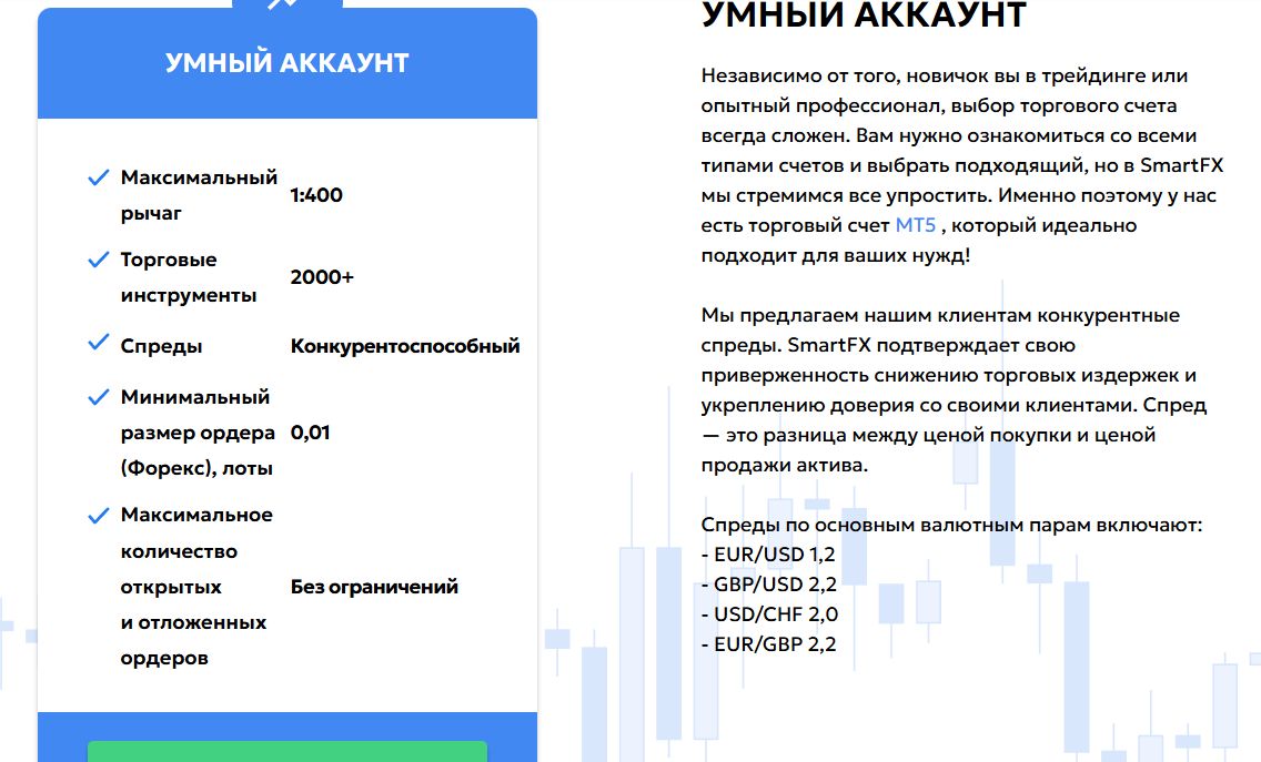Система заработка Smartfx broker включает в себя лишь один универсальный торговый счет под названием Smart Account.