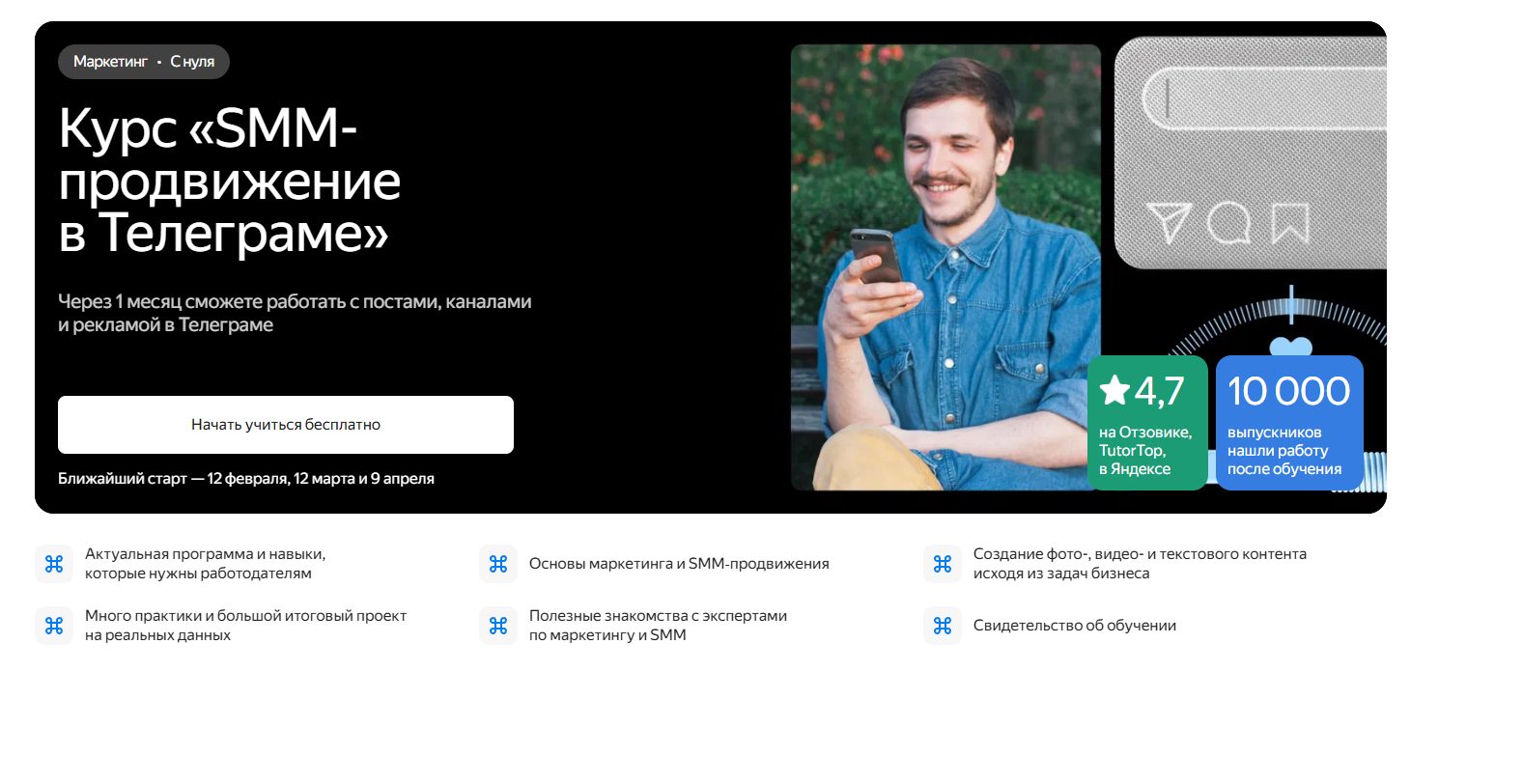 Telegram уже давно не просто чат. Это живая площадка для продвижения брендов, личных проектов и бизнеса. Спрос на специалистов по Telegram‑маркетингу растет. На этом фоне Яндекс Практикум запустил короткий, «по делу» курс «SMM‑продвижение в Телеграме». Курс для тех, кто хочет быстро разобраться в основе и сразу применить ее на практике. Вы научитесь работать с каналами, настраивать и покупать рекламу, читать аналитику и делать выводы.