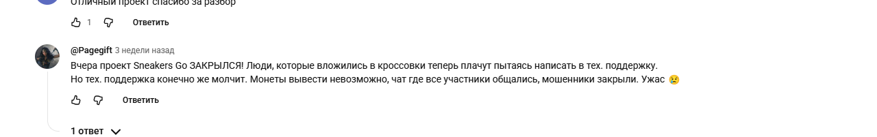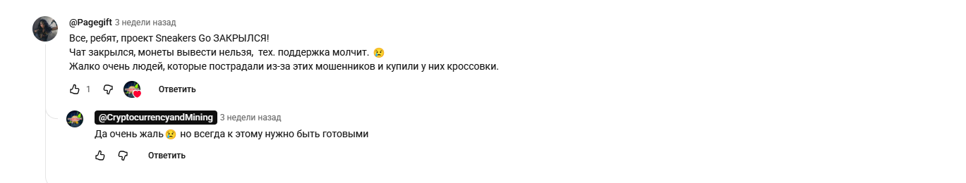 Под обзорами рефоводов на YouTube про игру Sneakers Go отзывы скептические. Пользователи утверждают, что это скам. Деньги вывести невозможно.