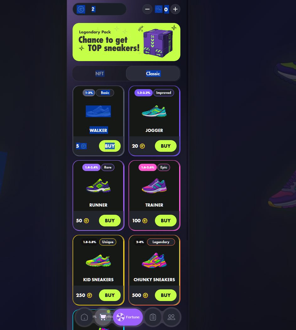 Одновременно можно инвестировать в три варианта кроссовок. Дополнительный апгрейд, ремонт и обновление обувки приносит больший процент ежедневной прибыли.
