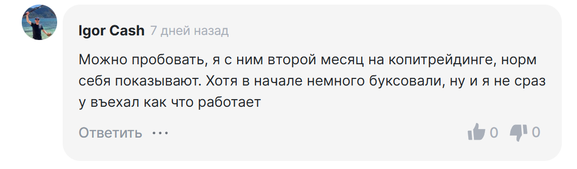 На фоне небольшой популярности канала и отсутствия на нем опции комментирования найти реальные отзывы о SNR Analyst весьма сложно. В тех мнениях, что попадаются, какие-то конкретные жалобы отсутствуют. Некоторые пользователи даже утверждают, что первое время можно попробовать силы в копитрейдинге. При этом гарантировать доходность все-таки никто не будет.