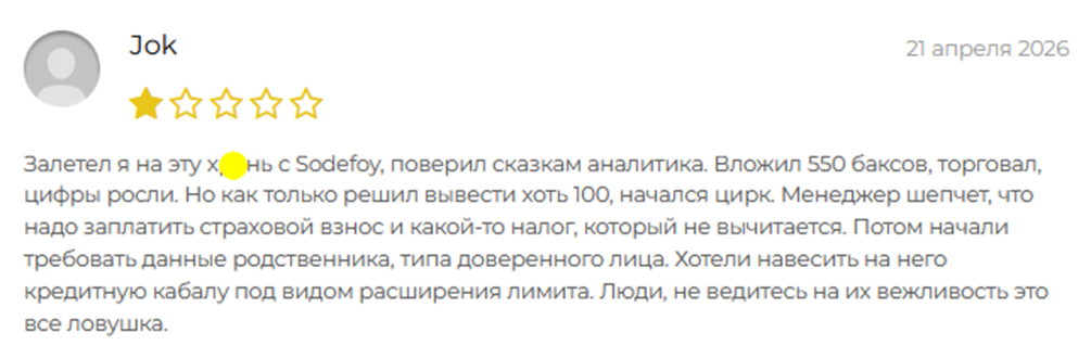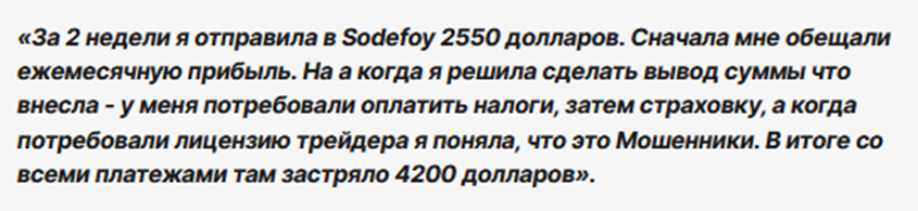 Найденные отзывы о брокере Sodefoy негативные. Пострадавшие клиенты платформы говорят о том, что это самый обычный развод – Содефой не выводит деньги. Пользователям заявляют о необходимости покупки налоговых кодов, внесения взносов по страховкам. Но даже после таких выплат получить заработок не выходит.