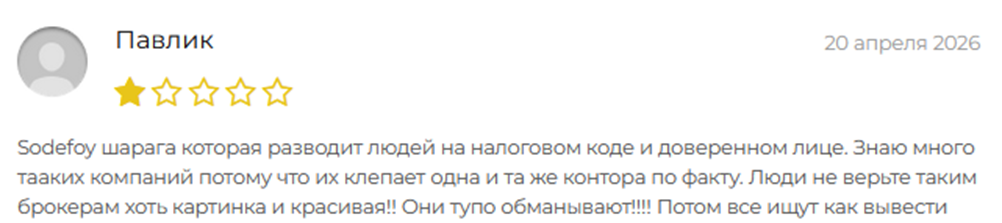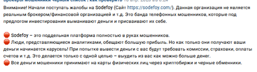 На независимых мониторингах можно найти предупреждения об этом брокере. В отзывах о Sode Foy говорится, что это самая обычная «банда финансовых мошенников», которая выманивает деньги. Никаких аналитиков или профессиональных трейдеров нет. Депозиты они принимают через нелегальные обменники или карты физических лиц, то есть вернуть средства нельзя.