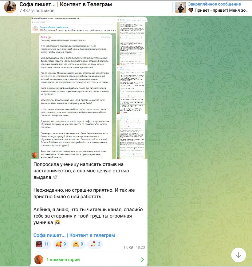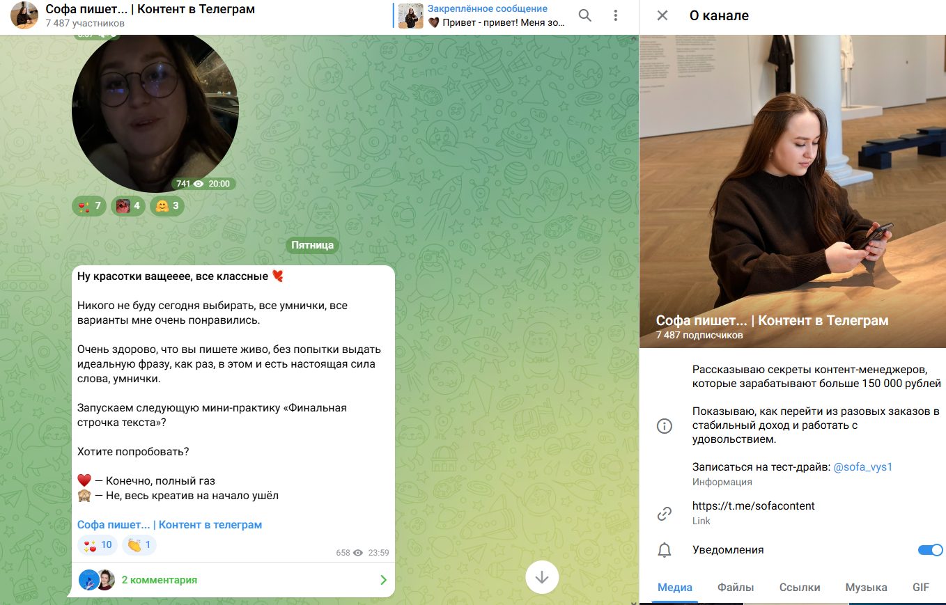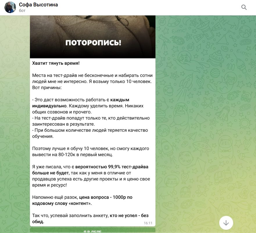 Софа Высотина отзывы в сети еще не получила. Девушка ведет общедоступный блог, посвященный секретам контент-менеджеров. Она предлагает пройти платный тест-драйв, в котором обещает предоставить обучение по заработку на создании контента в Телеграмме. Софа уверяет, что поможет ученикам выйти на ежемесячный доход от 80 000 рублей, и далее расскажем о проекте подробнее.