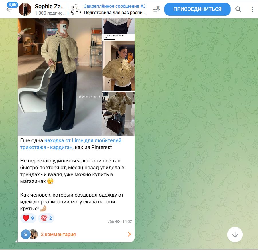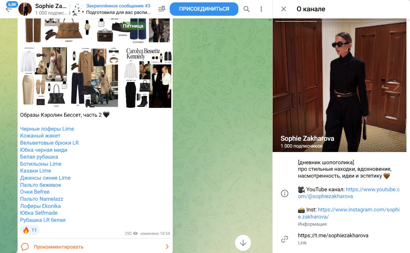 Вероятно, на рекламе София получает дополнительную прибыль. Основательница тг-сообщества подготавливает расписание с темами, которые потом разбираются в fashion комьюнити.