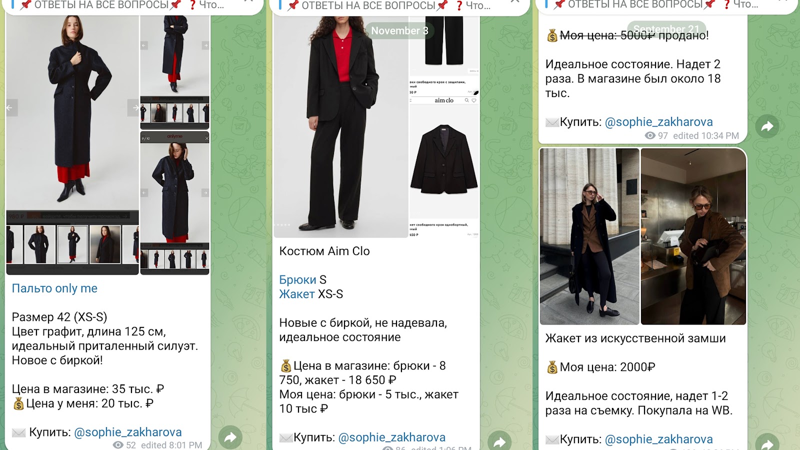 Захарова оставляет ссылку на тг-канал, где публикует актуальные вещи в ее магазине. Из предложенного: