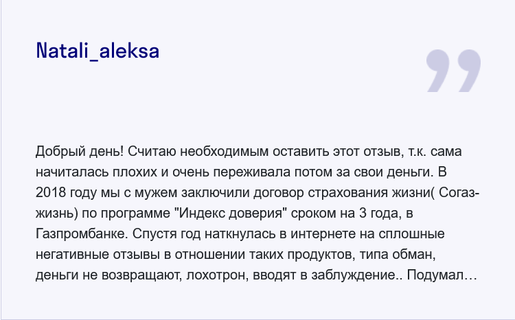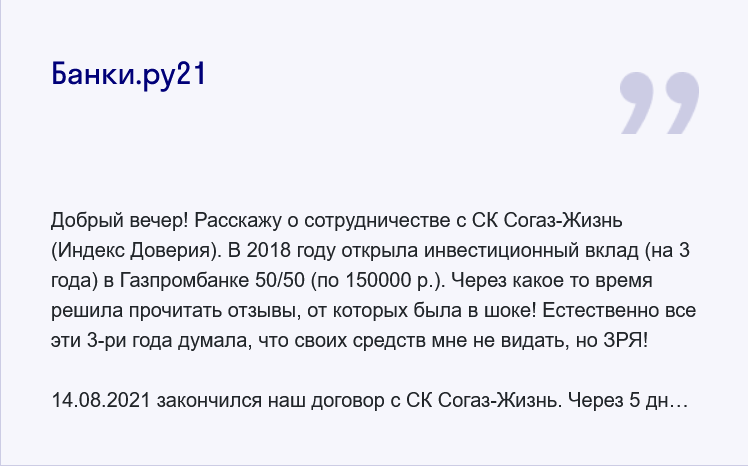 В отзывах о правилах и инвестициях «Согаз Жизнь» и «Индекс доверия» люди указывают на то, что заключив договор через «ГазПромБанк» можно рассчитывать на доходность, которую не дают «ВТБ» и «Сбер».
