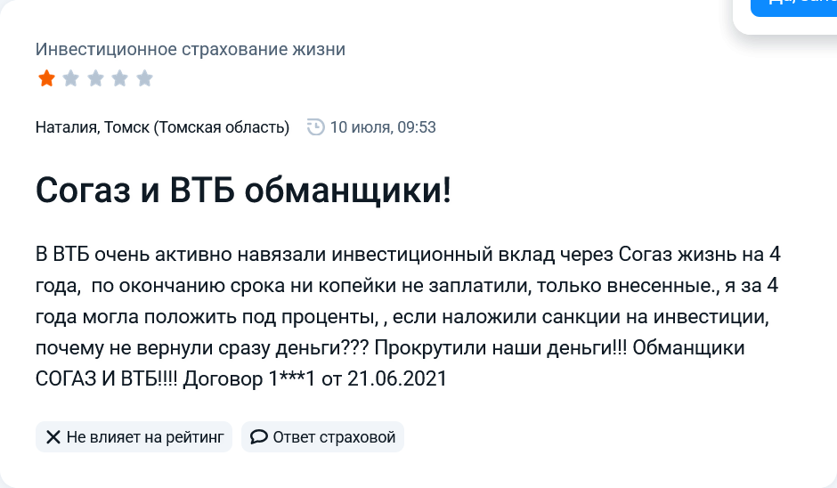 Также клиенты пишут в отзывах об инвест-вкладах от «Согаз Жизнь» через «ВТБ» об обмане, о том, что ни копейки не заплатили, клиент не только не заработал, но и потерял.