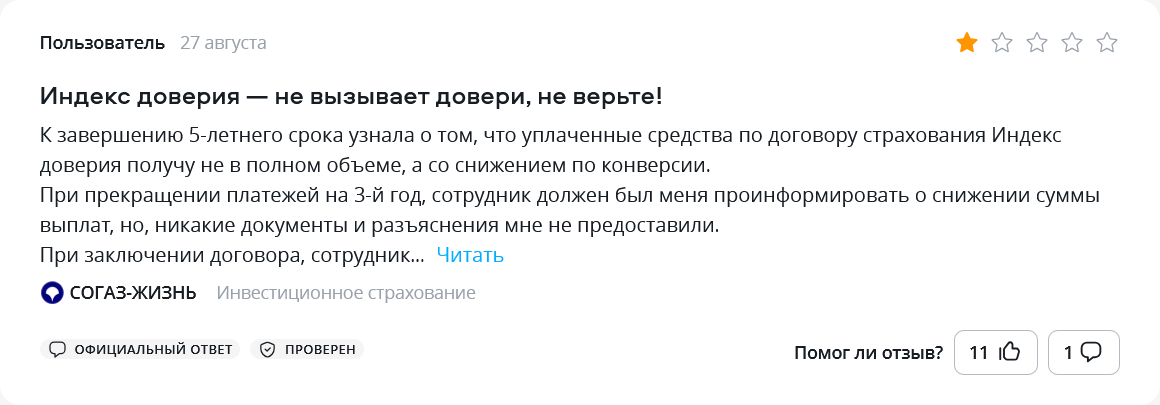 Однако на независимых платформах можно встретить только негативные фидбэки страхователей. Клиенты рассказывают о том, что выплаты по договору снижают в конце срока действия, якобы, из-за упадка конверсии. Люди сетуют на то, что могли положить на этот срок деньги на депозит и заработать на процентах.