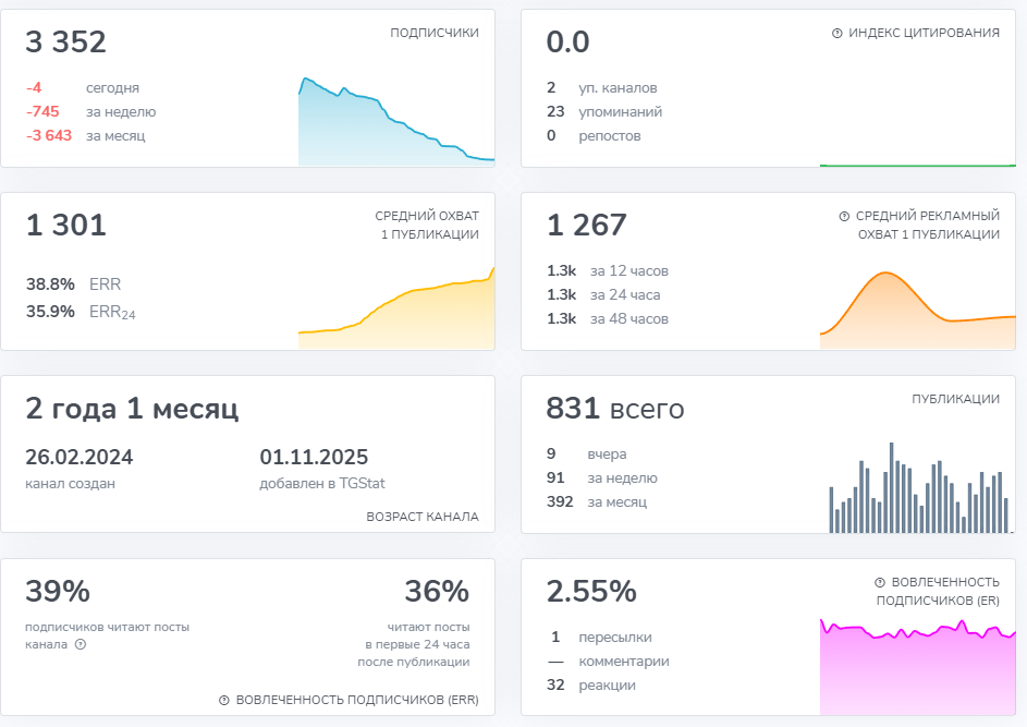 В марте 2026 года на канале было около 3500 участников, но статистика с TgStat показывает, что за последний месяц ушло столько же подписчиков. Несмотря на то, что посты просматривают 39% аудитории, а вовлеченность составляет 2.55%, есть признаки накрутки, ведь индекс цитирования нулевой.