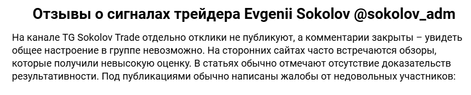 При этом нет ни одного довольного подписчика, который бы получил положительный результат от повтора сделок за автором, а есть только разоблачения Евгения Соколова, указывающие на плохую репутацию в сети.