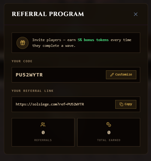 После запуска никаких бонусных монет не дают, но их можно получить за пост в Твиттер с упоминанием игры Sol Siege. Апгрейдов очень много, так как улучшать нужно атаку, защиту, выносливость, удачу и так далее, причем делать это можно бесплатно, только придется потратить больше времени. Также есть реферальная программа, где предлагают получать 5% за каждого приглашенного участника.