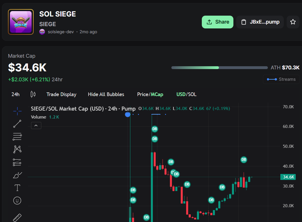 О создателях крипто-игры Sol Siege информации нет, так как проект разработали на платформе Pump fun, а о других работах команды ничего неизвестно. Каких-то данных о сборе средств через пресейл или частные инвестиции тоже не нашлось, поэтому можно предположить, что владельцы используют модель справедливого запуска, то есть, токен начал торговаться сразу после выпуска.