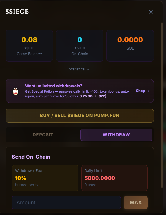 Комиссия на вывод составляет 10%, а максимальный лимит 5 000 токенов в день, но можно снять эти ограничения, если купить специальное зелье за 0.25 SOL.