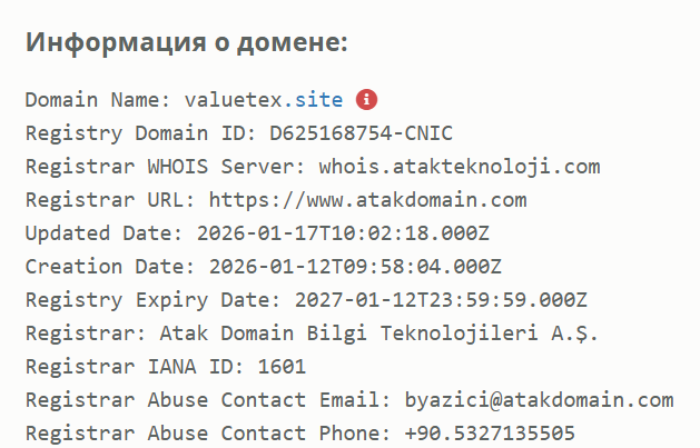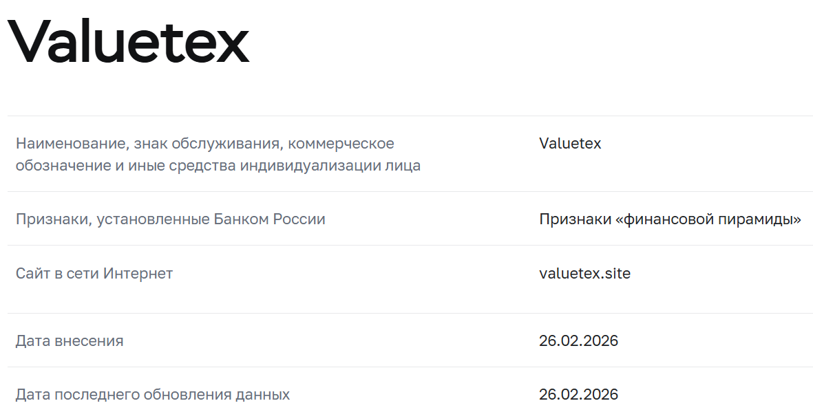О проекте информации практически нет, так как во время проверки в марте 2026 года при входе на сайт Valuetex site появлялось предупреждение о блокировке, а на веб-архиве никаких снимков не найдено.