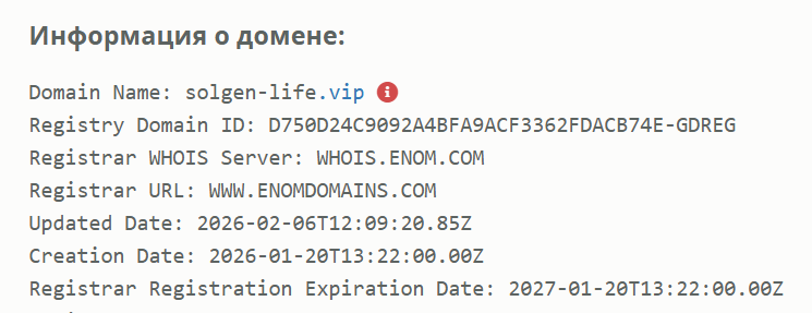 Сайт Solgen-Life vip, который тоже относится к проекту, во время проверки оказался доступен, но там нет никакой информации, а только форма регистрации и входа в аккаунт. Проверка домена показала, что его тоже создали лишь в январе 2026 года, поэтому все факты указывают на отсутствие истории работы.