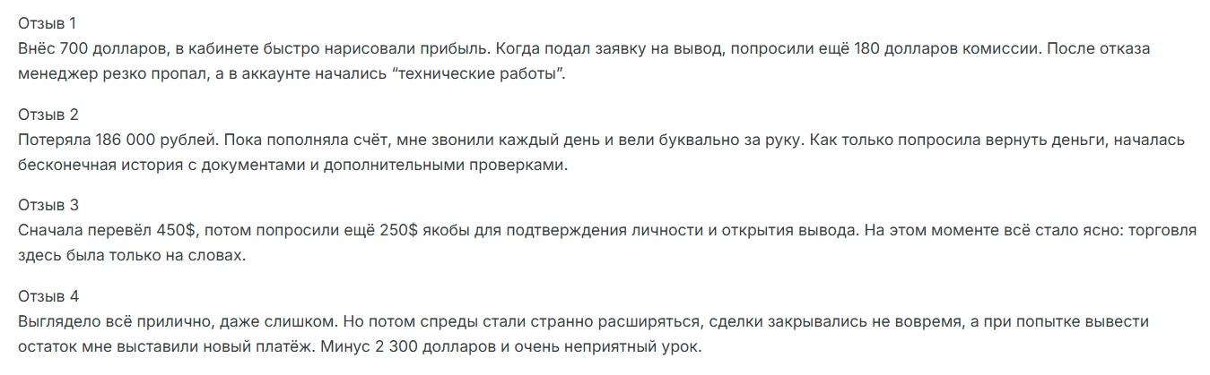 Пользователи описывают разные случаи при сотрудничестве с брокером, например, но все сходятся в одном – вывести средства с площадки не получится. У одних постоянно требовали какие-то документы, у других – дополнительные взносы, а третьим вообще закрыли доступ в аккаунт.
