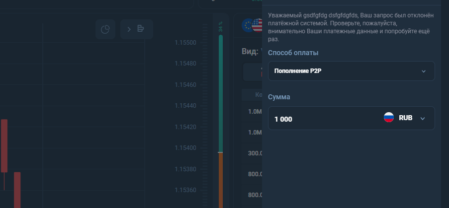 Реальный счет валютный, но внесение депозита доступно только в криптовалюте, и хотя указан P2P, во время проверки писали, что запрос отклонен.