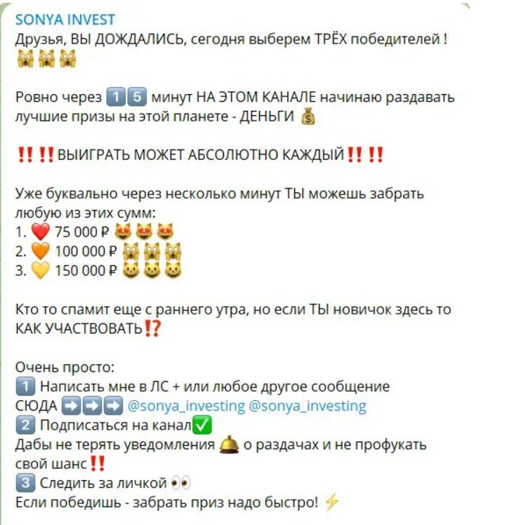 Sonya Invest — это телеграм канал, который маскируется под платформу, где ежедневно разыгрывают крупные суммы: от 200 000 до 300 000 рублей, а деньги якобы раздают безвозмездно за сотрудничество с разными компаниями. Организаторы утверждают, что для участия достаточно просто подписаться, написать менеджеру в чат и дождаться сообщения о «выигрыше» — никаких реальных, окупаемых шагов от пользователя не требуется. Что за прием применяют владельцы канала, как это работает и чем опасно для пользователей, рассказываем в этой статье.