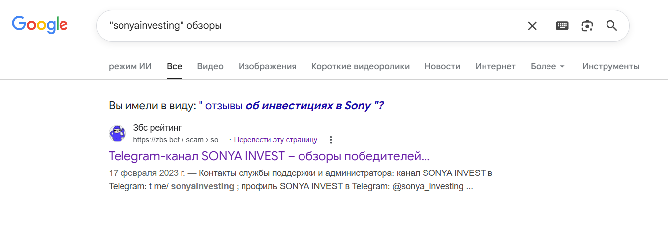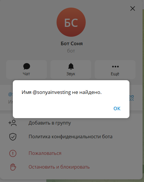 Информации о реальном владельце канала SonyaInvesting практически нет. При попытке перейти в канал по адресу t me/sonyainvesting выдается сообщение о том, что такое имя не найдено.