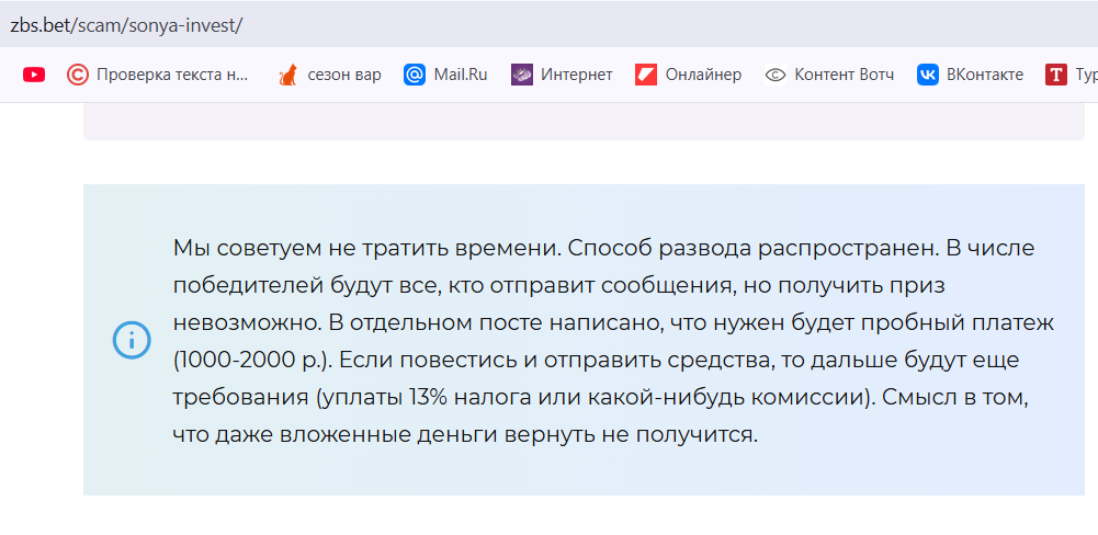 Такие ресурсы, как ZBS Bet, отмечают, что в публичных обзорах фигурируют только негативные жалобы на невозможность вывести призы или вернуть уже отправленные средства. также там не советуют вообще связываться с Соней, т.к. в последующем бот потребует внесения платежа, чтобы забрать приз.