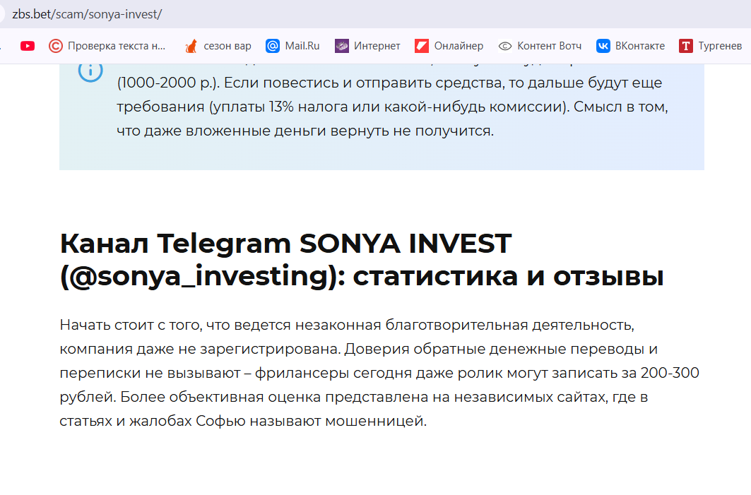 Аналитика по каналу Sonya Invest показывает практически полное отсутствие положительных, независимых отзывов.