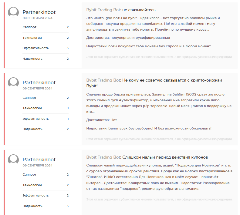 В сети можно найти отзывы о спотовом грид-боте на «Байбит», но комментарии в основном смешанные. Пользователи выделяют удобство программы и ее перспективы, но жалуются на плохую работу алгоритма и невозможность торговать без участия человека.
