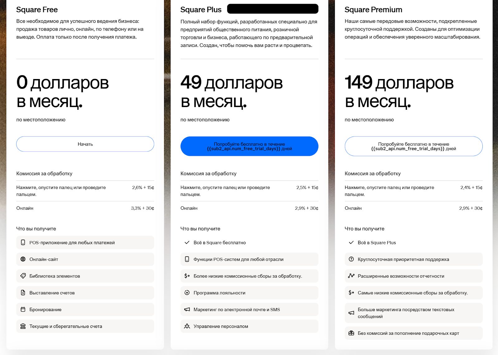 - Есть дополнительная абонентская плата за специфику, например, для владельцев ресторанного бизнеса предложен Square for Restaurants за 60 долларов в месяц.