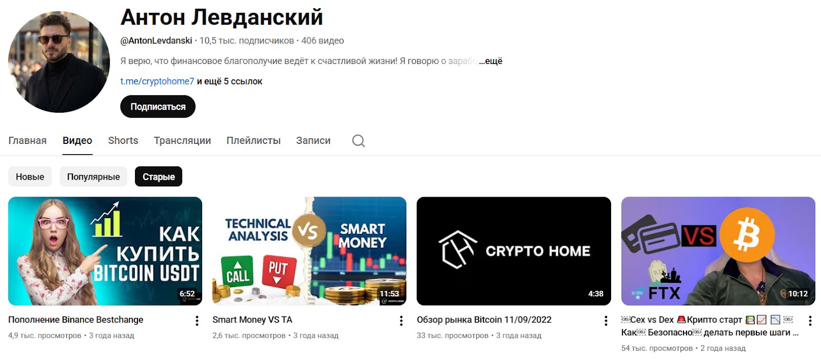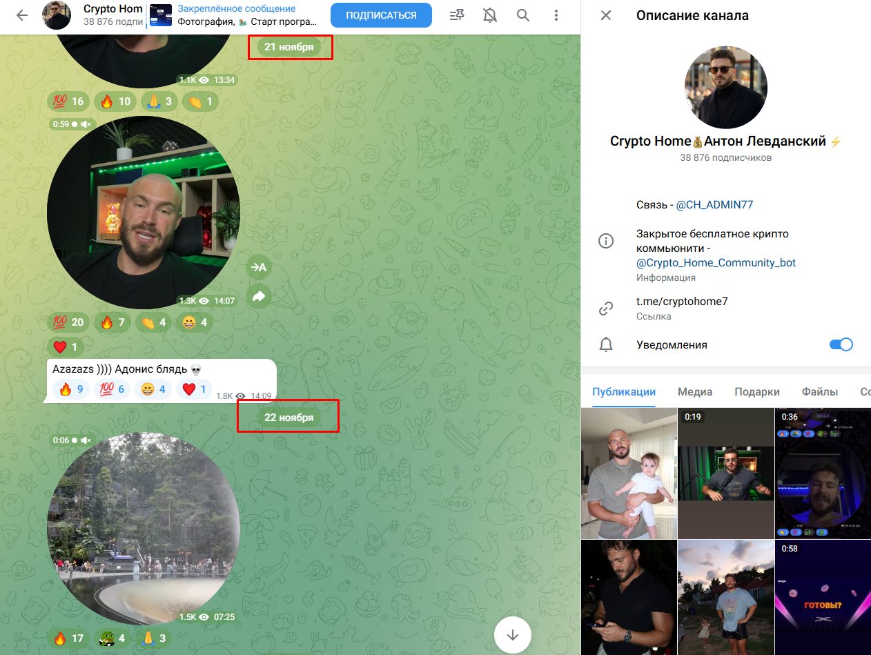 Начать анализ стоит с автора проекта Crypto Home. Владельцем является блогер, Антон Левданский, который начал свою деятельность около 3 лет назад. Изначально он просто выкладывал простые инструкции на YouTube, но забросил это дело и через год вернулся с новым контентом. Сейчас CH ADMIN выкладывает уроки по теханализу и якобы учит трейдеров “делать деньги”, однако на деле он просто переводит трафик из YouTube / рекламы в приватное тг сообщество.