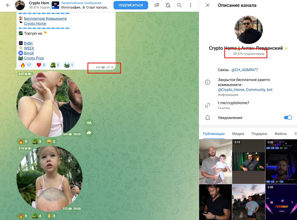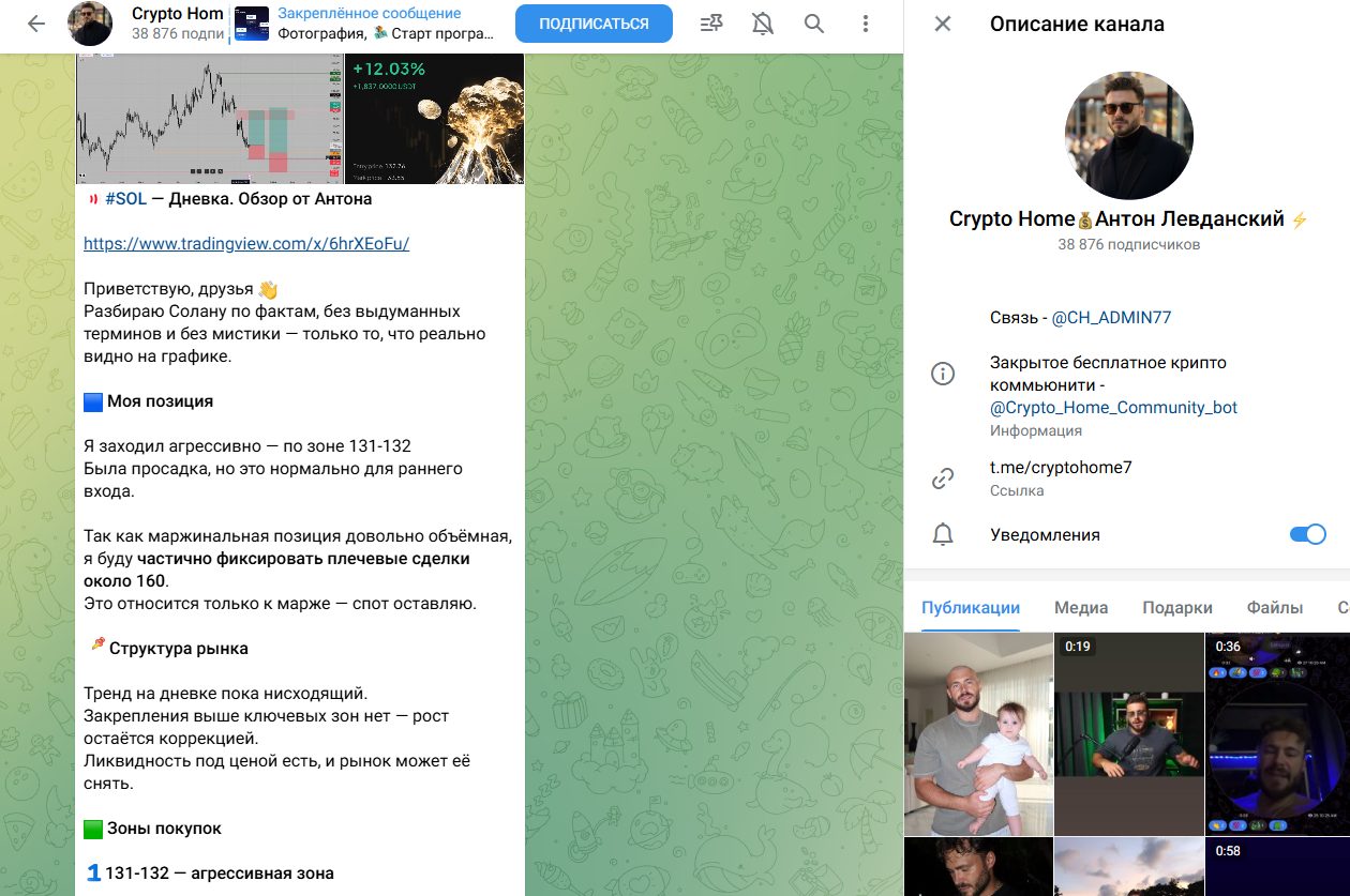 Антон Левданский, основатель Crypto Home, любит давить на эмоции не только в анализе, но и закрепленных публикациях. Вокруг себя он строит историю “сильного человека, который смог”. При этом статистика в бесплатном канале отсутствует, а прозрачность нулевая. Несмотря на аудиторию в 38 000 человек, охваты едва превышают сотни просмотров, что говорит о накрутке ботов. Вдобавок тематика более 50% контента не связана с рынком вообще. Там CH ADMIN просто делится богатой жизнью, личными мотивационными речами и семейной жизнью.