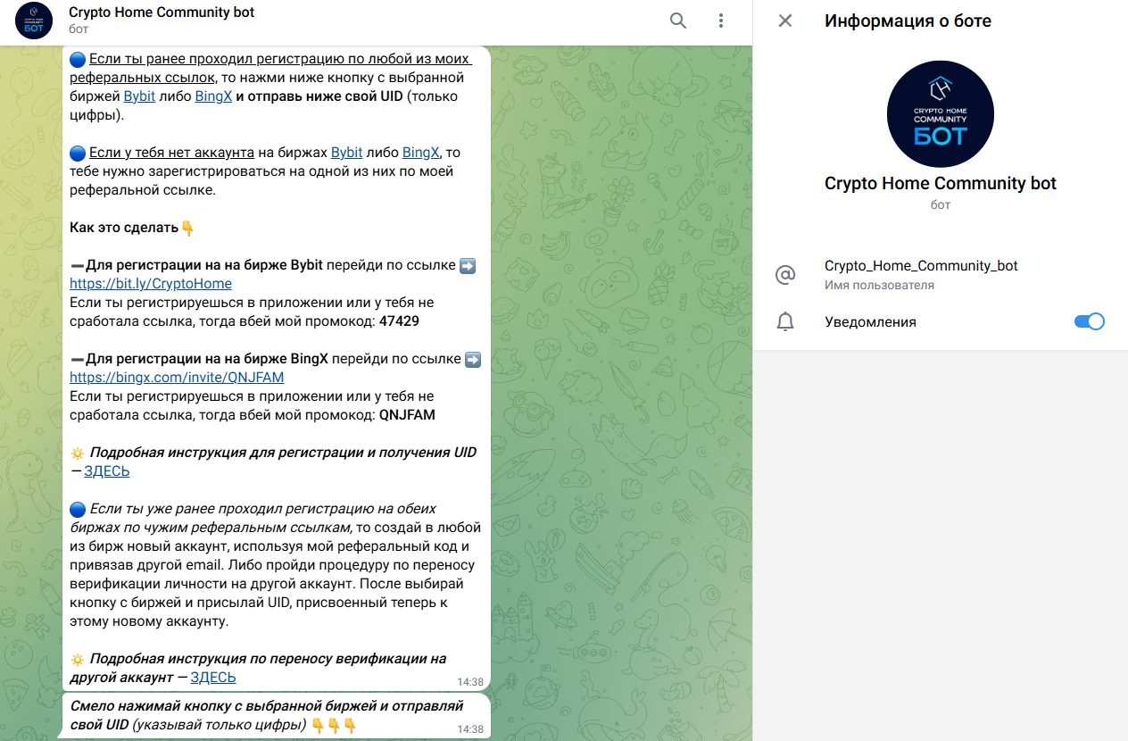 В ленте тг канала CryptoHome7 крайне редко встречаются полезные посты. Хоть автор и выкладывает структурные публикации, где делится мыслями по ТА, риск менеджменту, основной фокус остается на приватном клубе и соц контенте. Антон везде рекламирует свой проект и отправляет ссылки на бота Crypto Home Community Bot, где уже просит пройти регистрацию по рефералке. Поэтому основная цель трейдера это не выгодная торговля, а просто лидогенерация для заработка на проценте от торговых комиссий.