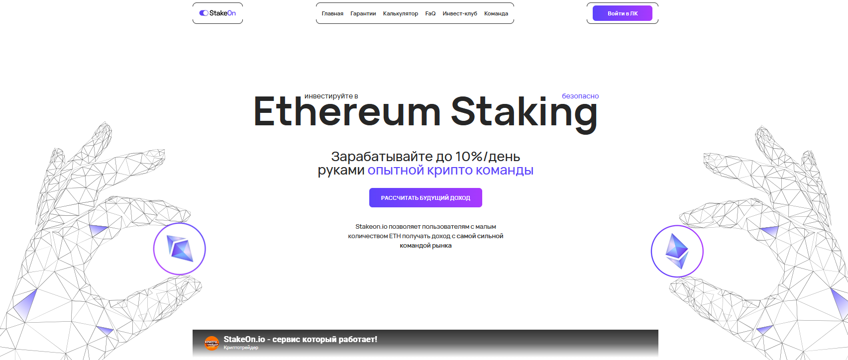 Инвестиционный криптопроект Stakeon io предлагает возможность якобы быстрого заработка на стейкинге токена Ethereum. Потенциальным пользователям обещают до 10% прибыли в день, помощь опытной команды и мгновенный вывод средств.