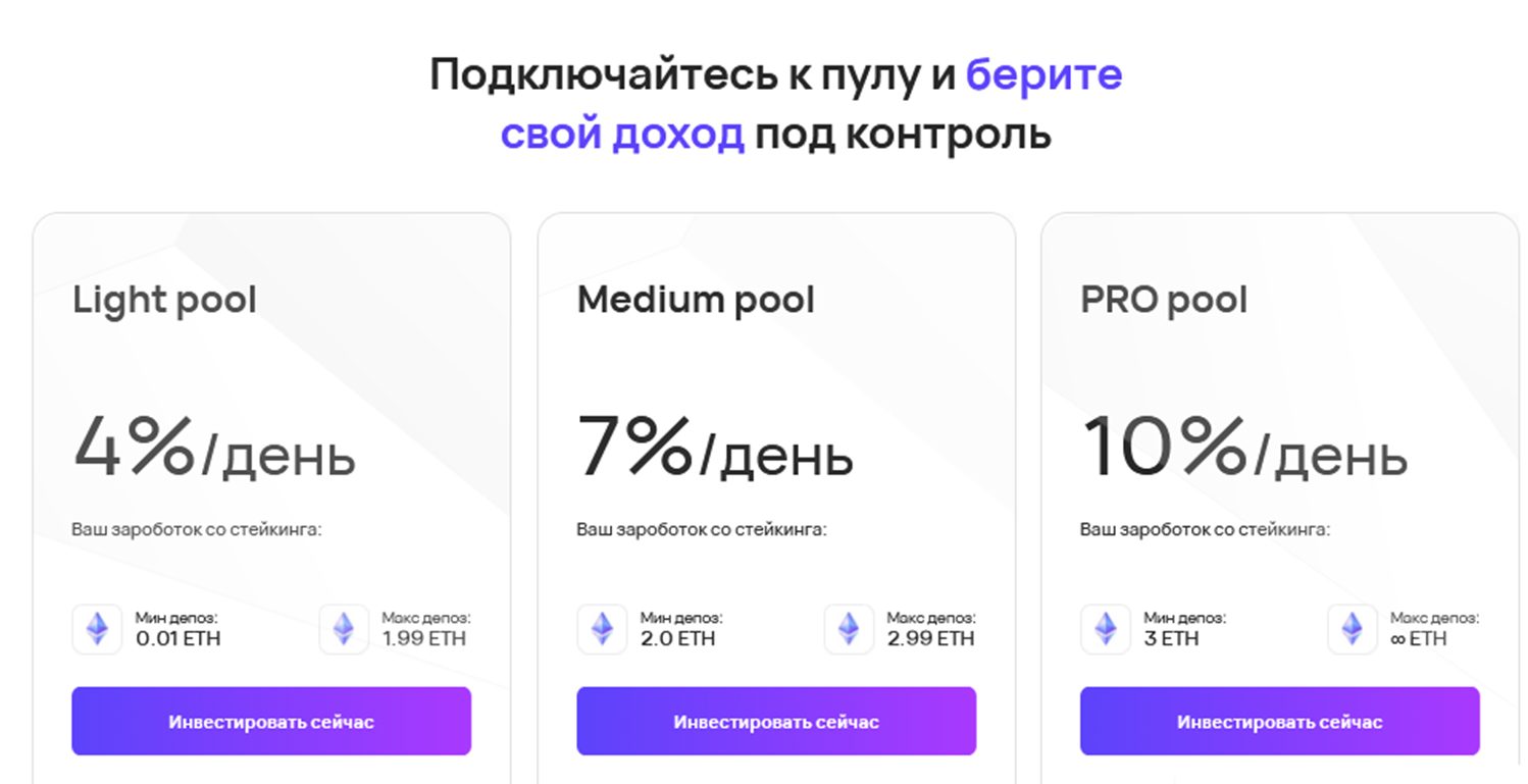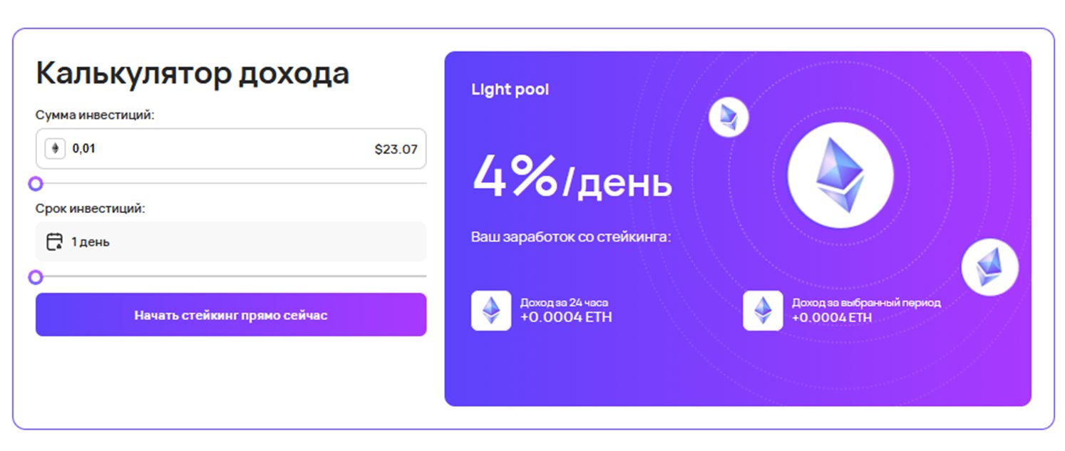 - Light Pool с доходностью 4% в день и минимальным депозитом от 0,01 ETH;