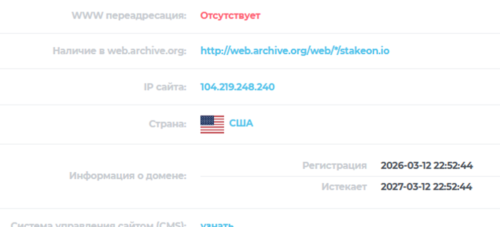 Домен stakeon io был зарегистрирован через американский IP 12 марта 2026 года, то есть площадка проработала немногим больше месяца. Это ставит под сомнения заявления о высоких прибылях, успешных кейсах и тысячной аудитории.