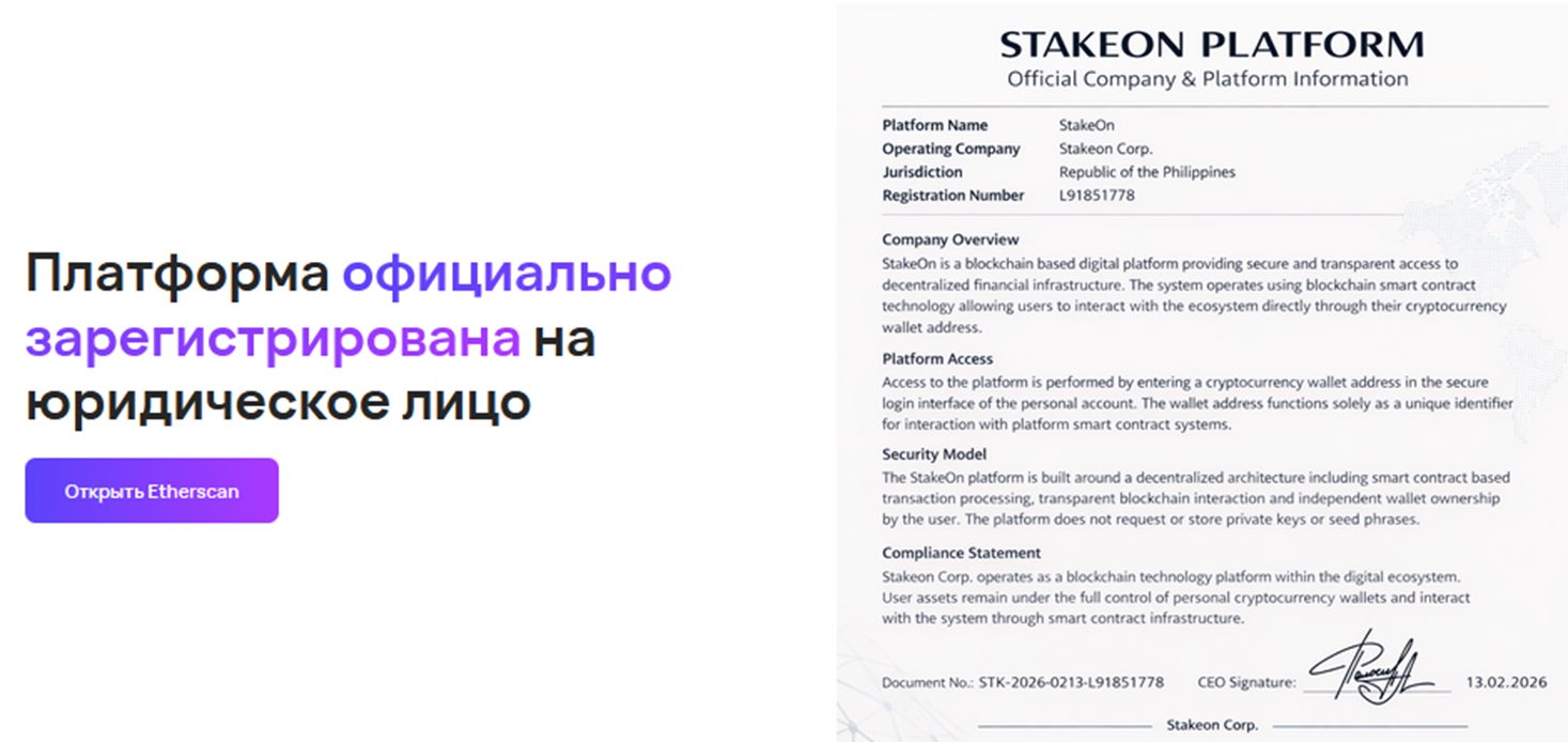 На сайте указано, что платформа официально оформлена на юрлицо – корпорацию StakeOn Corp. Приводится якобы копия документа с регистрационным номером. Страной прописки компании указана Филиппинская Республика. Но никаких подтверждений существования такой организации не найдено. Подлинность документа также не доказана.