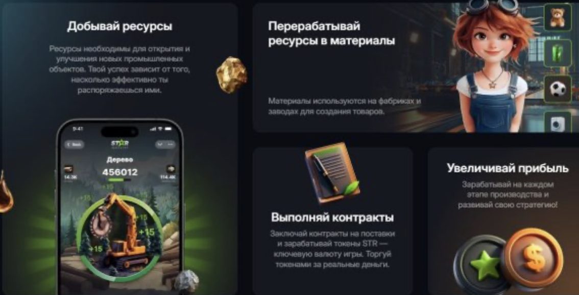 Вход в Star Industry Game заявлен как бесплатный: валюта и звезды накапливаются от цепочек «добыча — производство — продажа». Также доход строится на результатах ежедневных заданий, рефералке и соревнованиях.
