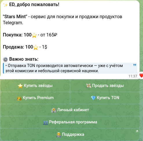 Отправка TON производится автоматически с учетом комиссии сети и сервисной наценки. Конкретный размер наценки в стартовом сообщении не указан. Курс покупки в 165 рублей за 100 звезд — на уровне рынка.