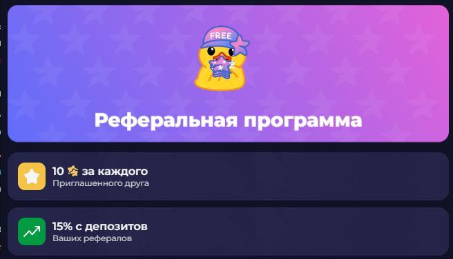 Реферальная программа стандартная для таких проектов. За каждого приглашенного друга платят 10 Stars. 15% от депозитов идет на счет пригласившего. Это слишком выгодная система, поэтому в честности StarsomBot есть серьезные сомнения.