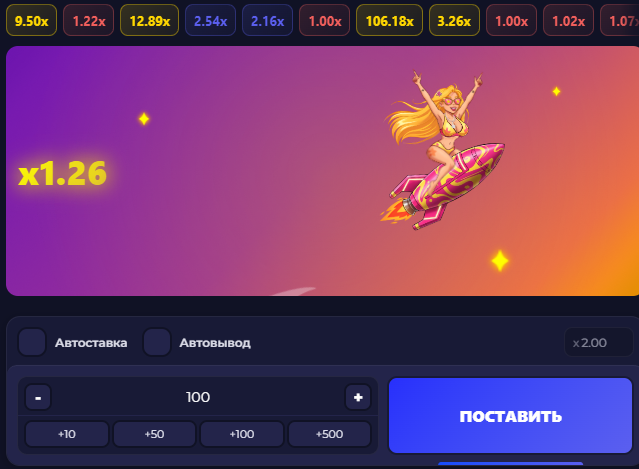 Интерфейс Starsom характерен для всех краш-игр. Девушка летит на ракете и может остановиться в любой момент. Чем больше коэффициент — тем выше выигрыш. Стандартная тактика для таких игр.